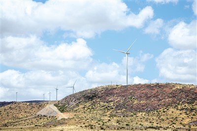 在南非北開普省德阿鎮(zhèn),中國龍?jiān)措娏瘓F(tuán)南非公司運(yùn)營的德阿風(fēng)電項(xiàng)目風(fēng)機(jī)。