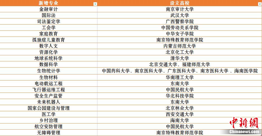 記者梳理發(fā)現(xiàn),21種新專業(yè)涉及10大類,包括金融審計、國際法、司法鑒定學(xué)、工會學(xué)、家庭教育、孤獨癥兒童教育、數(shù)字人文、資源化學(xué)、地球系統(tǒng)科學(xué)、數(shù)據(jù)科學(xué)、生物統(tǒng)計學(xué)、生物材料、電動載運工程、飛行器運維工程、安全生產(chǎn)監(jiān)管、未來機器人、國家公園建設(shè)與管理、醫(yī)工學(xué)、鄉(xiāng)村治理、航空安防管理、無障礙管理。