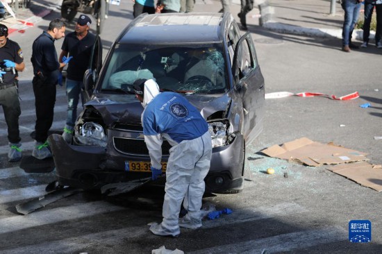 4月24日,警察在耶路撒冷駕車襲擊事件現(xiàn)場工作。新華社發(fā)(穆阿馬爾·阿瓦德 攝)