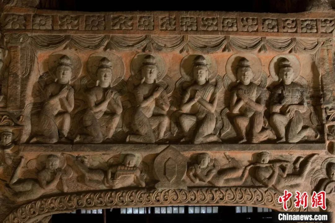 云岡石窟第12窟又名“音樂窟”,前殿上壁雕塑的數(shù)十身伎樂天人形象正在演奏琵琶、篳篥、古琴等各種中西式樂器,是中國古代最早的宮廷交響樂團(tuán)。武俊杰 攝