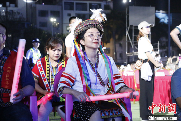 圖為4月22日晚,海南省臺(tái)聯(lián)副會(huì)長(zhǎng)劉芳穎身著臺(tái)灣少數(shù)民族服飾出席在樂東舉行的“三月三”開幕活動(dòng)。 中新社記者 朱賀 攝