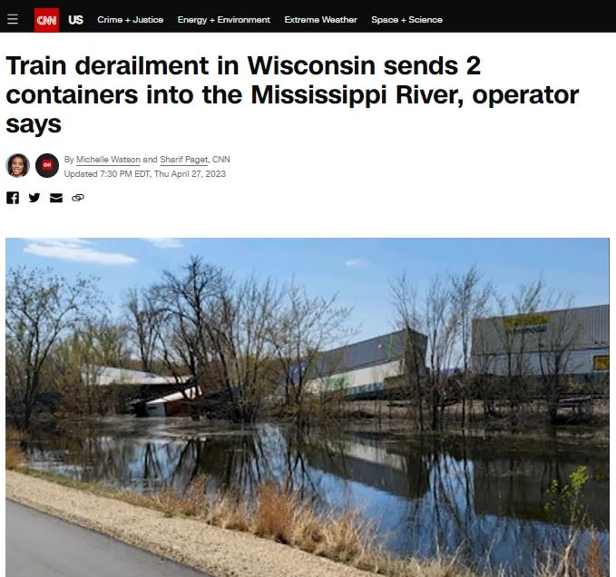 中新網(wǎng)4月28日電 據(jù)美國有線電視新聞網(wǎng)(CNN)報道,當(dāng)?shù)貢r間27日,一列火車在美國威斯康星州西南部脫軌,多節(jié)車廂掉入附近的密西西比河。