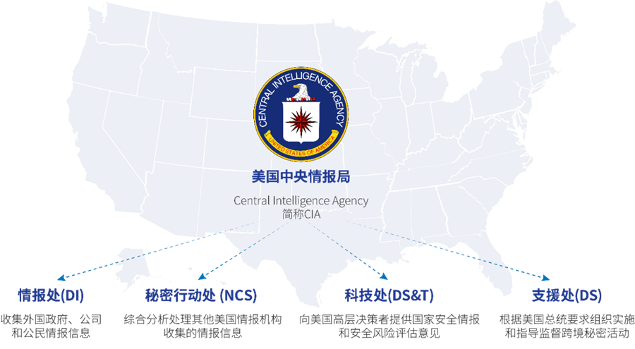 CIA是美國(guó)聯(lián)邦政府主要情報(bào)機(jī)構(gòu)之一,總部位于美國(guó)弗吉尼亞州蘭利,下設(shè)情報(bào)處(DI)、秘密行動(dòng)處(NCS)、科技處(DS&T)、支援處(DS)四個(gè)部門(mén)。其主要業(yè)務(wù)范圍涉及:收集外國(guó)政府、公司和公民情報(bào)信息;綜合分析處理其他美國(guó)情報(bào)機(jī)構(gòu)收集的情報(bào)信息;向美國(guó)高層決策者提供國(guó)家安全情報(bào)和安全風(fēng)險(xiǎn)評(píng)估意見(jiàn);根據(jù)美國(guó)總統(tǒng)要求組織實(shí)施和指導(dǎo)監(jiān)督跨境秘密活動(dòng)等。