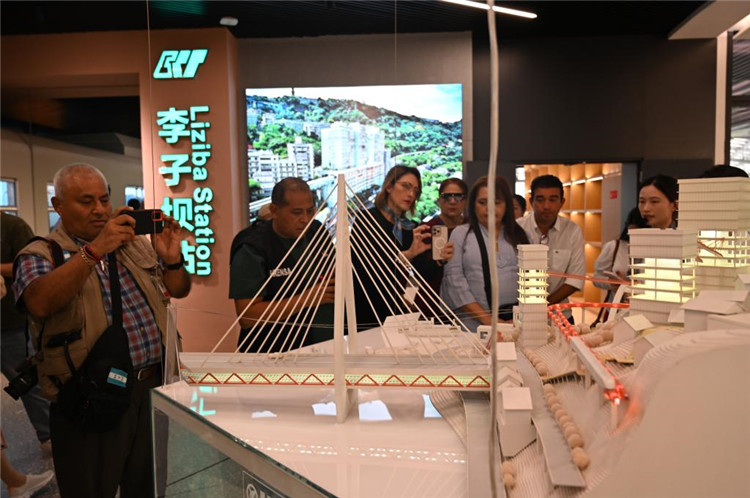 5月2日,在重慶市規(guī)劃展覽館,洪都拉斯媒體代表團(tuán)一行參觀重慶立體交通模型。新華社記者 趙佳樂 攝
