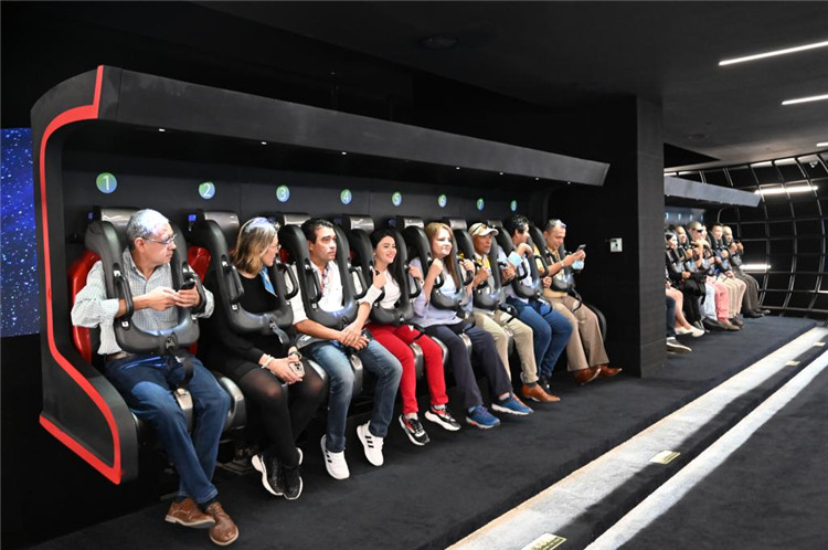 5月2日,洪都拉斯媒體代表團(tuán)一行在重慶市規(guī)劃展覽館體驗(yàn)“飛越重慶”飛行影院。新華社記者 趙佳樂 攝