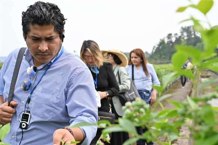 5月2日,洪都拉斯媒體代表團(tuán)代表團(tuán)走進(jìn)重慶市南川區(qū)大觀鎮(zhèn)藍(lán)莓產(chǎn)業(yè)示范基地。新華社記者 趙佳樂 攝