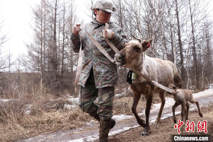 4月17日,覺樂按照老一輩使鹿鄂溫克人的法子,徒步陪著馴鹿遷徙。 (根河市融媒體中心供圖)