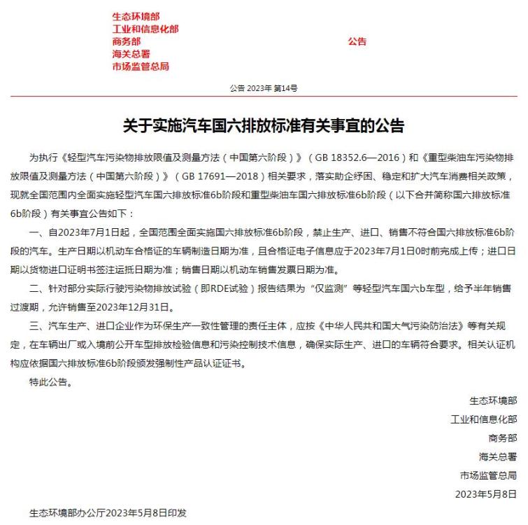 其中要求,自2023年7月1日起,全國(guó)范圍全面實(shí)施國(guó)六排放標(biāo)準(zhǔn)6b階段,禁止生產(chǎn)、進(jìn)口、銷(xiāo)售不符合國(guó)六排放標(biāo)準(zhǔn)6b階段的汽車(chē)。生產(chǎn)日期以機(jī)動(dòng)車(chē)合格證的車(chē)輛制造日期為準(zhǔn),且合格證電子信息應(yīng)于2023年7月1日0時(shí)前完成上傳;進(jìn)口日期以貨物進(jìn)口證明書(shū)簽注運(yùn)抵日期為準(zhǔn);銷(xiāo)售日期以機(jī)動(dòng)車(chē)銷(xiāo)售發(fā)票日期為準(zhǔn)。