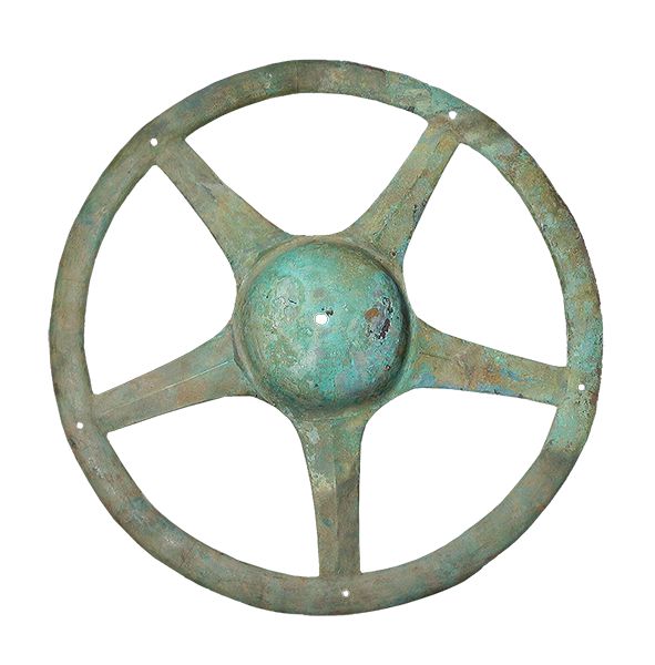 三星堆出土文物中,青銅太陽(yáng)輪形似如今的“方向盤”,其用途引來(lái)了種種猜測(cè):有研究者認(rèn)為這是車輪,還有觀點(diǎn)認(rèn)為是用于軍事作戰(zhàn)的盾牌上的盾飾。多數(shù)意見(jiàn)認(rèn)為,這種形制的器物應(yīng)即是“太陽(yáng)形器”。它是常設(shè)在古蜀國(guó)神廟中的神器,或用于祭祀儀式。