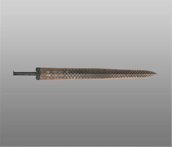 越王勾踐劍天下聞名。劍身中脊起棱,飾黑色菱形花紋。劍格正面嵌藍(lán)色琉璃,背面綠松石。歷經(jīng)兩千余年,紋飾仍然清晰精美、劍身鋒利無(wú)比。