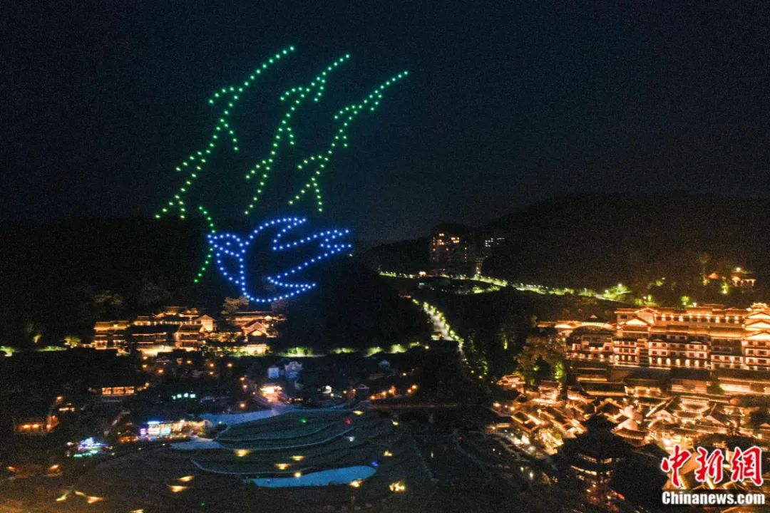 2022年6月,貴州省遵義市播州區(qū)烏江寨景區(qū)進行無人機編隊表演。(無人機照片)瞿宏倫 攝