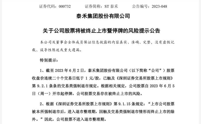 6月2日晚間,ST泰禾公告,截至當(dāng)日,公司股票收盤價(jià)連續(xù)20個(gè)交易日低于1元/股,已觸及交易類強(qiáng)制退市規(guī)定。根據(jù)相關(guān)規(guī)定,公司股票自6月5日開(kāi)市起停牌,公司股票交易存在被終止上市的風(fēng)險(xiǎn)。