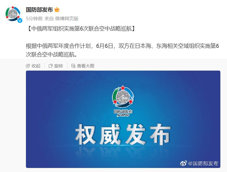 中新網6月6日電 據國防部新聞局官方微博消息,根據中俄兩軍年度合作計劃,6月6日,雙方在日本海、東海相關空域組織實施第6次聯合空中戰(zhàn)略巡航。