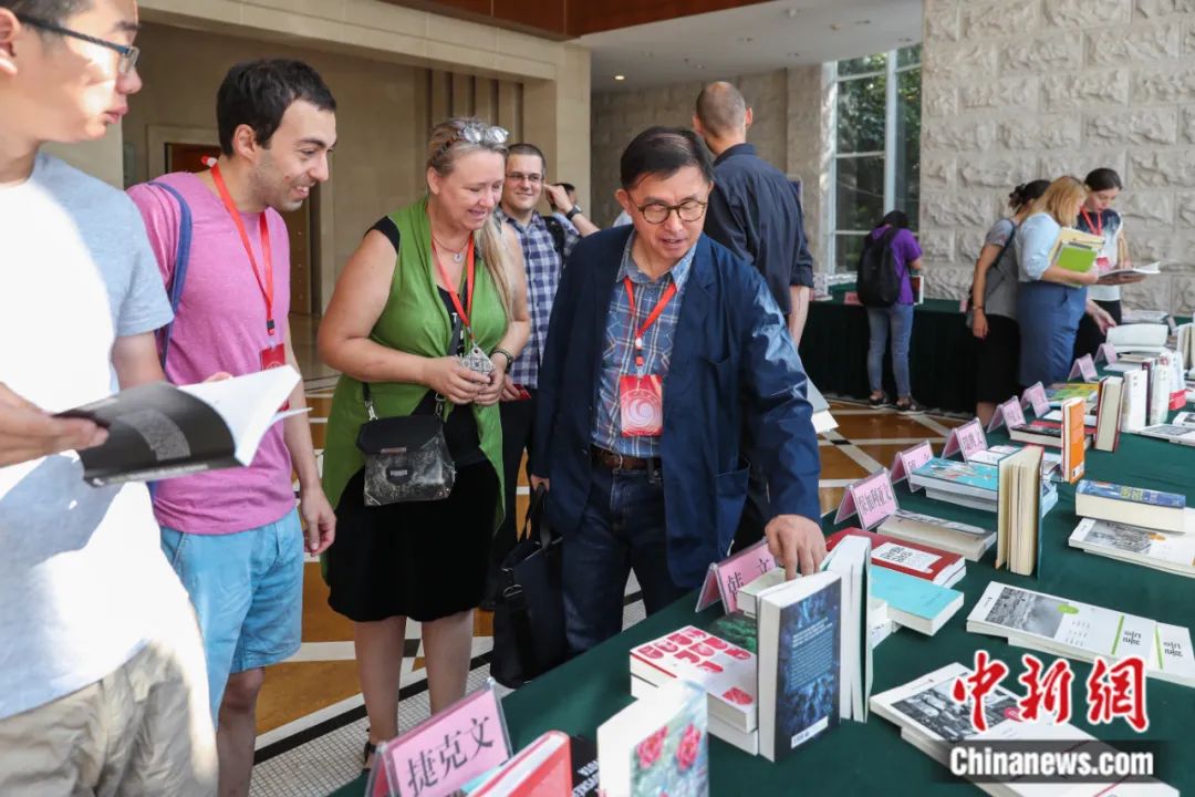 2018年,第五次漢學(xué)家文學(xué)翻譯國際研討會在貴陽舉行。圖為研討會上的翻譯作品展吸引海外翻譯家關(guān)注。賀俊怡 攝