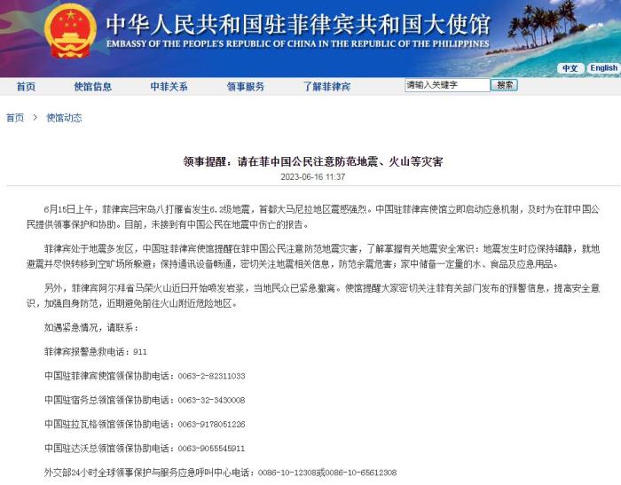 中新網(wǎng)6月16日電 據(jù)中國駐菲律賓大使館網(wǎng)站消息,6月15日上午,菲律賓呂宋島八打雁省發(fā)生6.2級(jí)地震,首都大馬尼拉地區(qū)震感強(qiáng)烈。中國駐菲律賓使館立即啟動(dòng)應(yīng)急機(jī)制,及時(shí)為在菲中國公民提供領(lǐng)事保護(hù)和協(xié)助。目前,未接到有中國公民在地震中傷亡的報(bào)告。