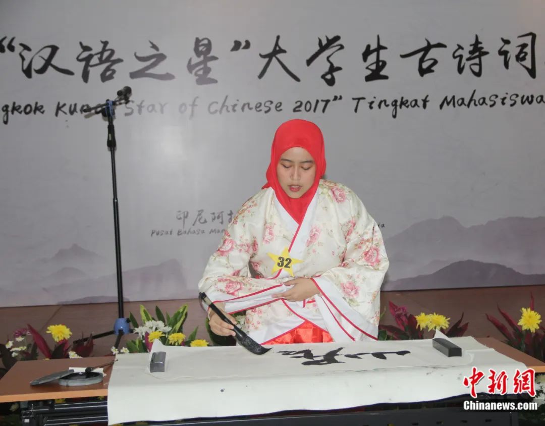 由中國(guó)孔子學(xué)院總部/國(guó)家漢辦主辦、印尼阿拉扎大學(xué)孔子學(xué)院承辦的2017“漢語之星”大學(xué)生古詩詞大賽在雅加達(dá)舉行。圖為印尼選手表演中國(guó)書法。林永傳 攝