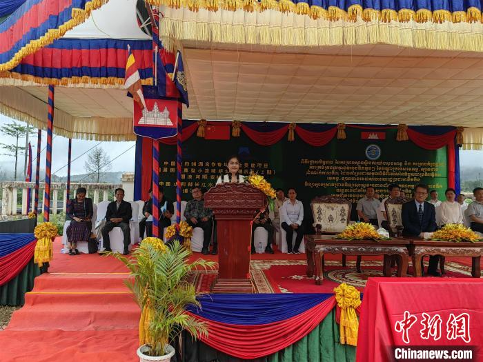 當(dāng)?shù)貢r間6月18日,“瀾湄國家典型小流域綜合治理示范(三期)”項目俄勒塞村成果移交儀式在柬埔寨國公省莫邦縣舉行。圖為中國駐柬埔寨大使館公使銜參贊趙海燕致辭?!≈行律缬浾?楊強(qiáng) 攝