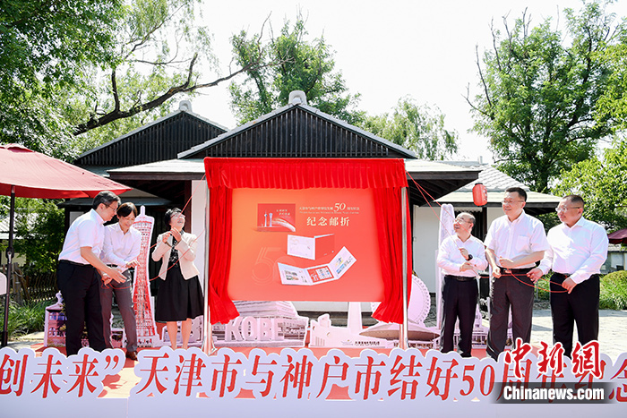 6月24日,中日嘉賓為《天津市與神戶市締結(jié)友城50周年紀(jì)念郵折》揭幕。當(dāng)日,主題為“接續(xù)友好 共創(chuàng)未來”天津市與神戶市結(jié)好50周年紀(jì)念活動在天津水上公園神戶園舉行。 中新社記者 佟郁 攝