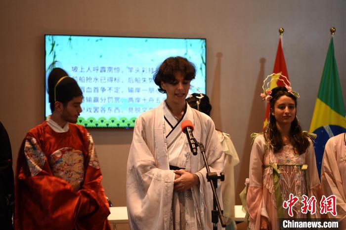 當(dāng)?shù)貢r(shí)間6月21日,中國(guó)駐圣保羅總領(lǐng)館舉行端午節(jié)開(kāi)放日活動(dòng),圣保羅州立大學(xué)孔子學(xué)院40余名學(xué)生赴約而來(lái)。記者在活動(dòng)上見(jiàn)到德卡馬戈時(shí),一起組隊(duì)表演古詩(shī)詞朗誦的五六個(gè)同學(xué)正為他的現(xiàn)身歡呼不已。