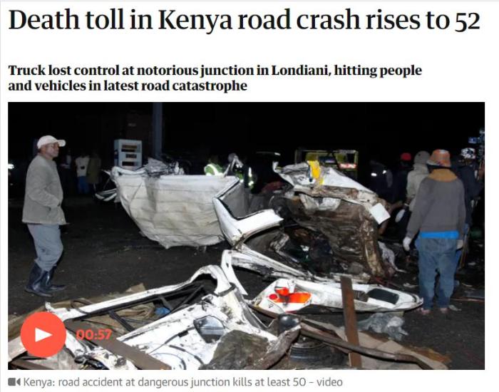 穆爾科門在一份聲明中表示,死亡人數(shù)為52人,另有32人受傷,并補(bǔ)充說,肇事卡車的注冊地是盧旺達(dá)。肯尼亞媒體報道稱,肇事車輛的司機(jī)已經(jīng)死亡,但法新社稱,這一消息無法立即得到證實(shí)。