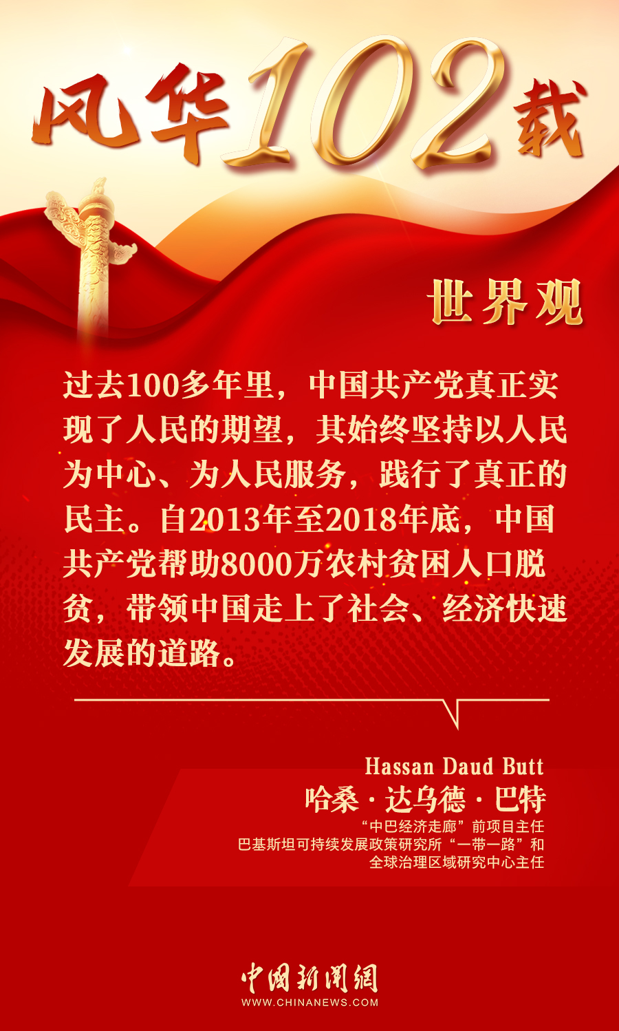 中新網(wǎng)7月8日電(陳彩霞)日前,投資領域專家,“中巴經(jīng)濟走廊”前項目主任、巴基斯坦可持續(xù)發(fā)展政策研究所“一帶一路”和全球治理區(qū)域研究中心主任哈?!み_烏德·巴特(Hassan Daud Butt)在接受中新網(wǎng)專訪時表示,過去100多年里,中國共產(chǎn)黨真正實現(xiàn)了人民的期望,其始終堅持以人民為中心、為人民服務,帶領中國走上了社會、經(jīng)濟快速發(fā)展的道路。