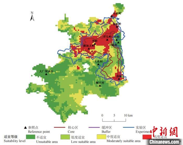 圖為科學(xué)家繪制出的海南霸王嶺一帶適合海南長臂猿棲息的區(qū)位圖。(許涵供圖)