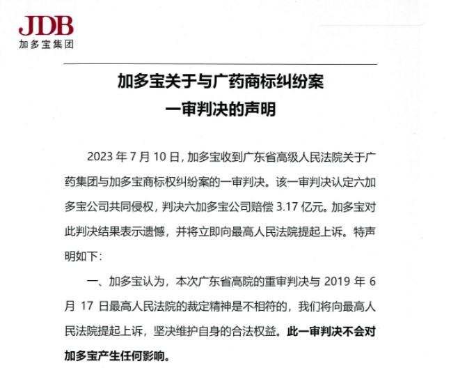 7月10日,加多寶發(fā)布《加多寶關(guān)于與廣藥商標(biāo)糾紛案一審判決的聲明》,稱當(dāng)天收到廣東省高級人民法院關(guān)于廣藥集團(tuán)與加多寶商標(biāo)權(quán)糾紛案的一審判決。該一審判決認(rèn)定六加多寶公司共同侵權(quán),判決六加多寶公司賠償3.17億元。