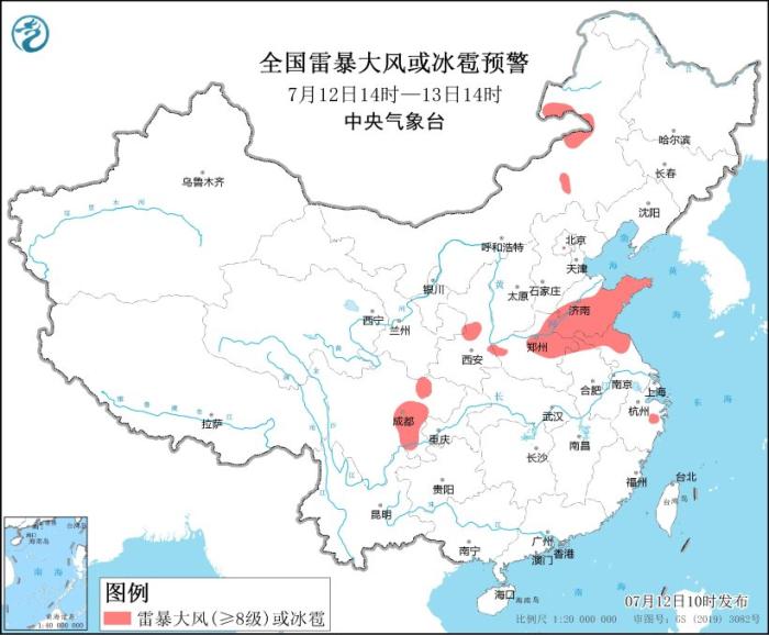 中新網(wǎng)7月12日電 據(jù)中央氣象臺網(wǎng)站消息,中央氣象臺7月12日10時繼續(xù)發(fā)布強對流天氣藍色預警:預計7月12日14時至13日14時,內(nèi)蒙古中東部、陜西中部、山東大部、河南東部、安徽北部、江蘇北部、四川盆地中西部等地的部分地區(qū)將有8-10級雷暴大風或冰雹天氣;內(nèi)蒙古中東部、青海東部、甘肅東部和南部、陜西中南部、山西中北部、河北南部、山東、河南中北部、安徽北部、江蘇北部、四川盆地西部、云南西南部等地的部分地區(qū)將有短時強降水天氣,小時雨量30-50毫米,局地可達60毫米以上。