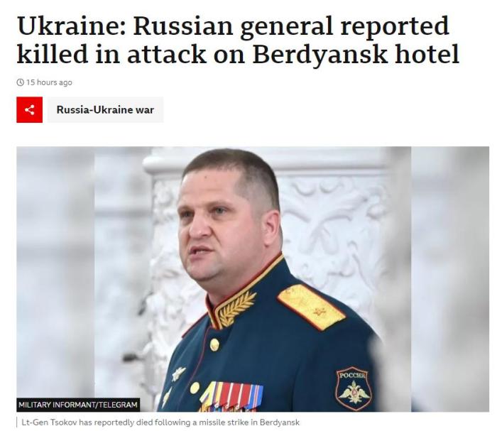英國廣播公司(BBC)報道俄羅斯南部軍區(qū)副司令措科夫遇襲身亡。圖片來源:BBC報道截圖