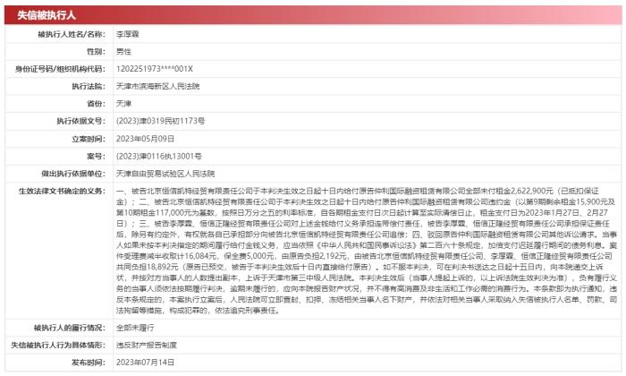 中國執(zhí)行信息公開網(wǎng)顯示,目前恒信璽利存在多條被執(zhí)行人信息,恒信璽利和李厚霖也多次收到限制消費(fèi)令。