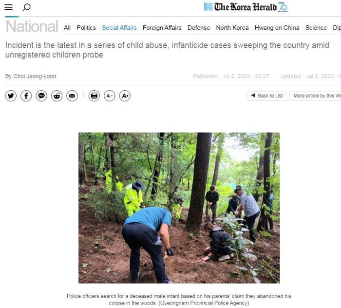 2023年7月2日,韓國(guó)慶尚南道警方稱,已向一名20多歲的男子和一名30多歲的女子發(fā)出逮捕令,原因是他們勒死了自己的孩子,并將尸體丟棄在慶尚南道巨濟(jì)附近的一條河里。
