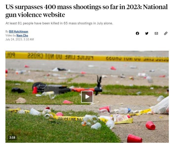 中新網(wǎng)7月24日電 據(jù)美國廣播公司(ABC)24日報道,美國“槍支暴力檔案”的數(shù)據(jù)顯示,在2023年,美國已發(fā)生超過400起大規(guī)模槍擊事件。該網(wǎng)站將大規(guī)模槍擊事件定義為造成4人或4人以上傷亡的單一事件。