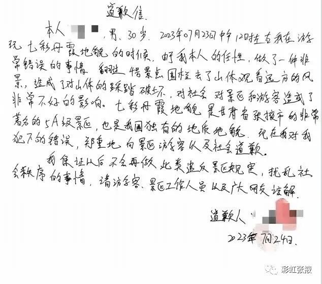 通報表示,該游客進入區(qū)域是張掖世界地質公園彩色丘陵保護范圍,雖然因其行走的山脊被黃土覆蓋,未造成實質性損害,但其行為違反了《張掖七彩丹霞保護條例》和《治安管理處罰法》相關規(guī)定。7月24日16:50該游客從旅游途中返回臨澤縣,接受相關部門調查處理。市、縣林草部門對該游客進行了嚴肅的批評教育;丹霞景區(qū)派出所依據《治安管理處罰法》對該游客處以200元罰款;該游客深刻認識到自身行為的錯誤性和嚴重性,并公開致歉。