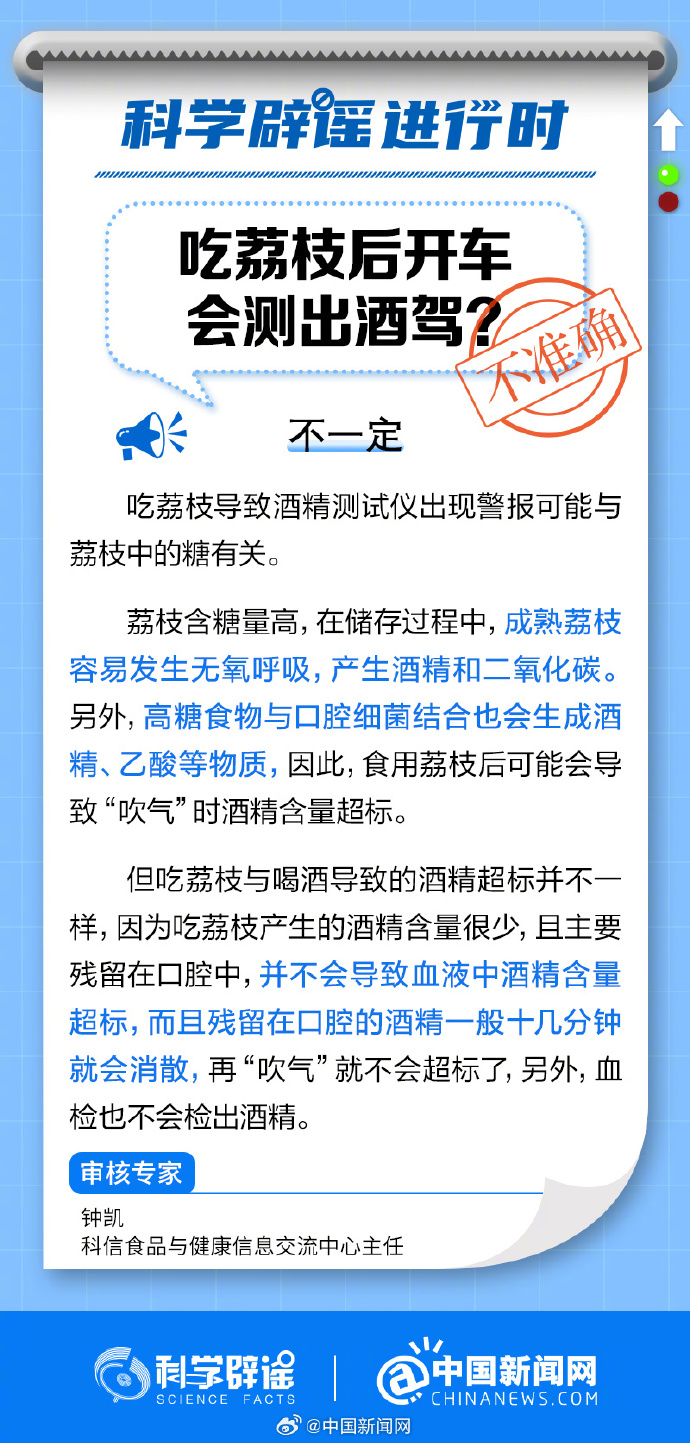 成熟荔枝容易發(fā)生無氧呼吸,產(chǎn)生酒精和二氧化碳。另外,高糖食物與口腔細菌結(jié)合也會生成酒精、乙酸等物質(zhì)。但吃荔枝產(chǎn)生的酒精含量很少,殘留在口腔的酒精一般十幾分鐘就會消散,血檢也不會檢出酒精。(來源:科學辟謠、中國新聞網(wǎng)微博)
