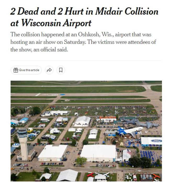 據(jù)《紐約時(shí)報(bào)》報(bào)道,美國聯(lián)邦航空管理局(FAA)稱,事故發(fā)生在威斯康星州奧什科什的惠特曼地區(qū)機(jī)場(chǎng)。在為期一周的活動(dòng)中,“實(shí)驗(yàn)飛機(jī)協(xié)會(huì)”在此舉辦飛行表演和航展。