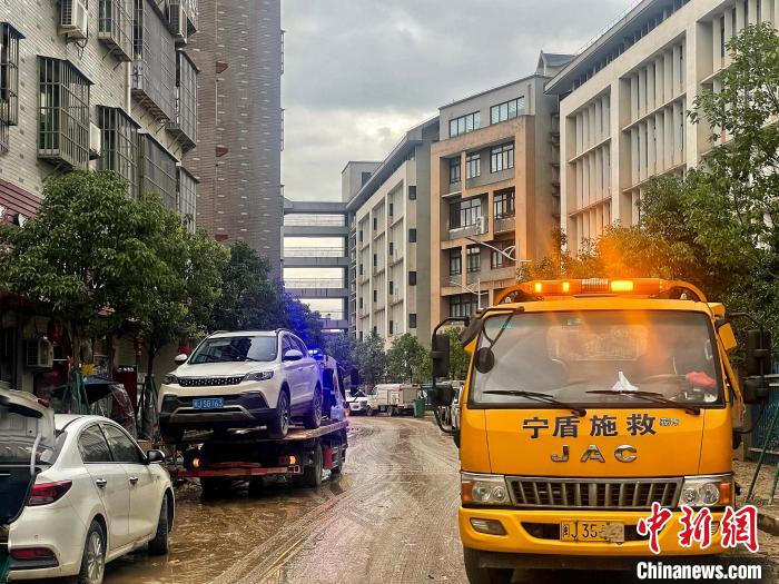 沿著中心街道往里走,越往里,積水退去后的殘留淤泥越多。街道兩側(cè),不時(shí)可看見堆放著不少被積水浸泡過后、無法使用的家具、生活用品以及貨物等,救援車將一部部受損車輛拖離現(xiàn)場(chǎng)。