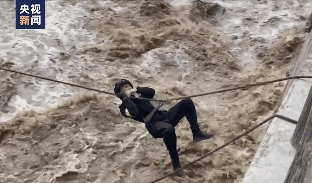 2022年9月5日,四川甘孜州瀘定縣發(fā)生6.8級地震,磨西鎮(zhèn)與青崗坪交匯處,湍急的流水?dāng)r住去路。甘孜特警隊(duì)員們用身體和繩索搭建橋梁,徒手爬繩索前往對岸救援。圖片來源:央視新聞視頻截圖