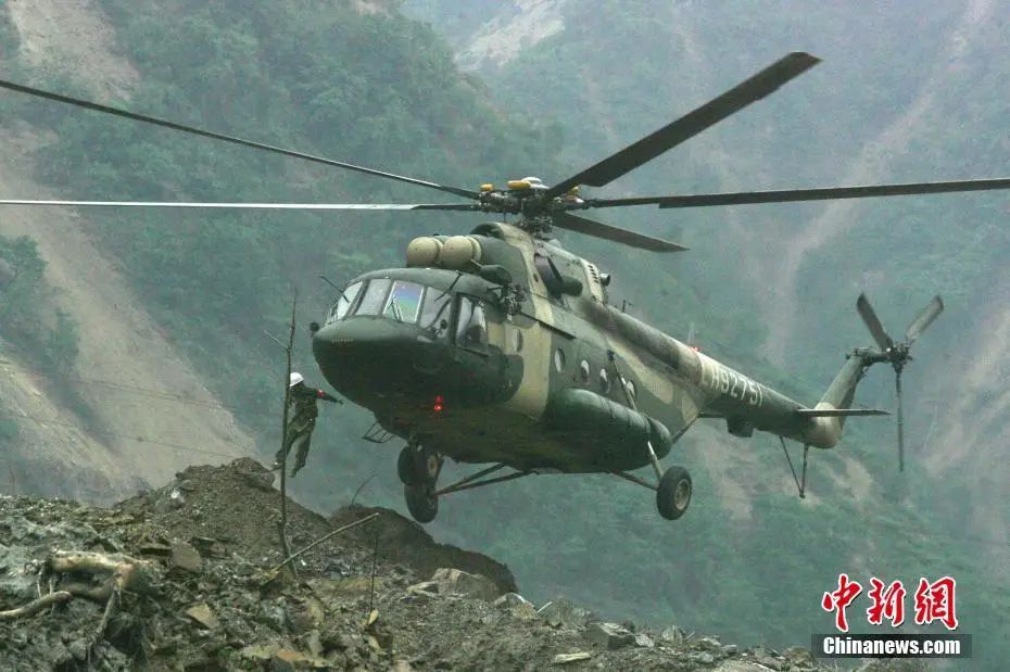2008年5月20日,成都軍區(qū)陸航團(tuán)姜廣偉王牌直升機(jī)組上午十時(shí)以單輪首次成功強(qiáng)降北川重災(zāi)區(qū)“定時(shí)炸彈”——堰塞湖無名塌方小土堆上。中新社記者 賈國榮 攝