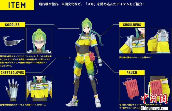 她的頭發(fā)和眼睛是綠色的,因為綠色是公司的代表色。此外,她身上有許多航空元素,護(hù)目鏡采用了飛機(jī)前窗的樣式,胸口和手套的原型是飛機(jī)的滑行道,肩膀上參考了機(jī)翼的設(shè)計,腰間還掛著一個行李箱樣式的小包。