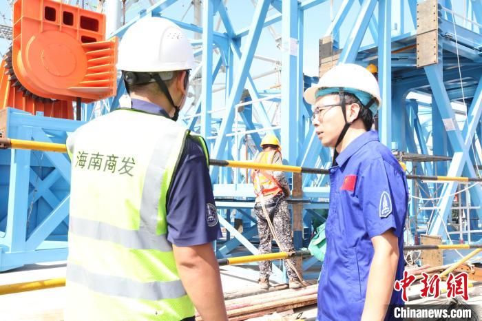 圖為首俊明在海南商業(yè)航天發(fā)射場1號工位向工人了解項目建設(shè)進展。符宇群攝