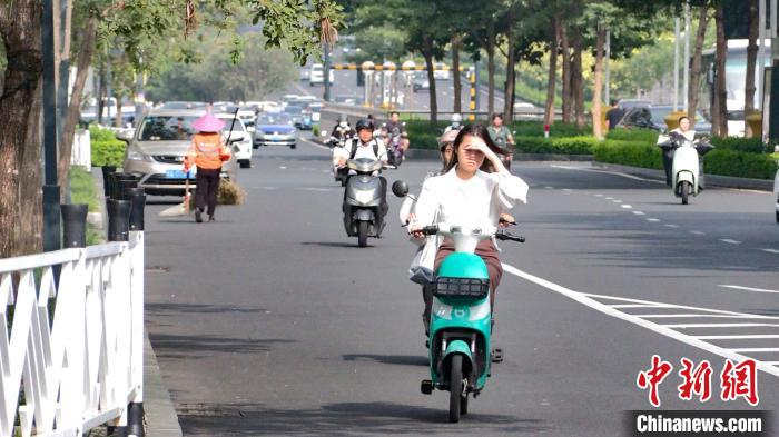 圖為一位女士騎電動車時用手遮擋陽光。王偉臣 攝
