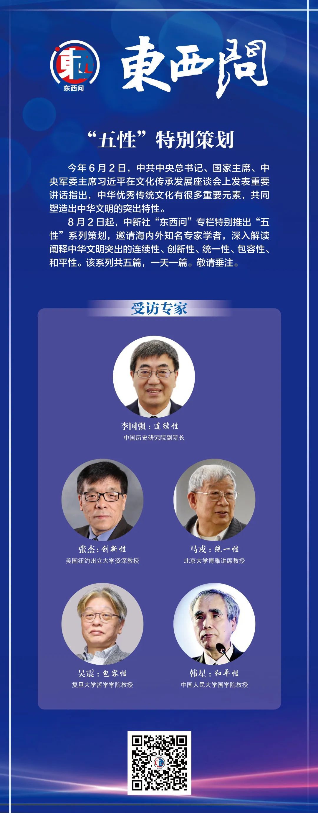 8月2日起,中新社“東西問”專欄特別推出“五性”系列策劃,邀請(qǐng)海內(nèi)外知名專家學(xué)者,深入解讀闡釋中華文明突出的連續(xù)性、創(chuàng)新性、統(tǒng)一性、包容性、和平性。該系列共五篇,一天一篇。敬請(qǐng)垂注。