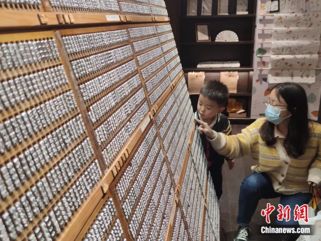 湖北武漢一書店內(nèi),一位母親給兒子講述中國(guó)古代四大發(fā)明之一印刷術(shù)的故事。李長(zhǎng)林 攝