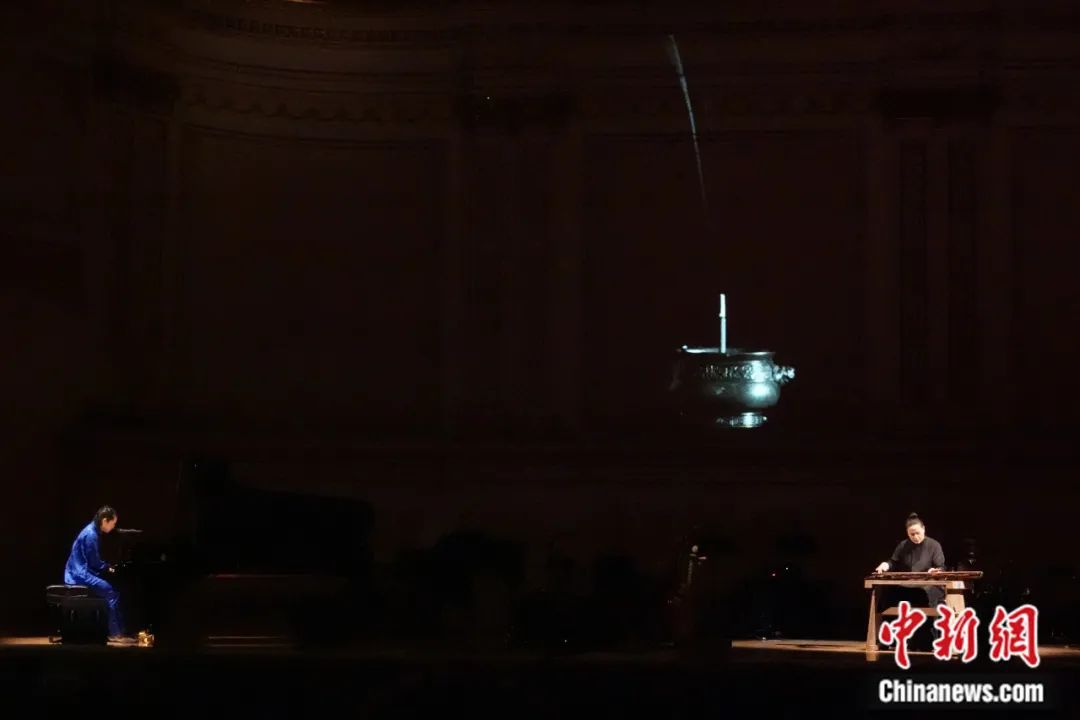 2023年7月1日,“紐約中美青年音樂節(jié)”在美國(guó)紐約卡內(nèi)基音樂廳舉行,來自中國(guó)和美國(guó)的青年音樂人演奏新國(guó)樂、實(shí)驗(yàn)世界音樂、實(shí)驗(yàn)民謠、新爵士樂,吸引當(dāng)?shù)赜^眾聆聽。圖為音樂人巫娜(右)與李帶菓以古琴和鋼琴演奏新國(guó)樂。廖攀 攝