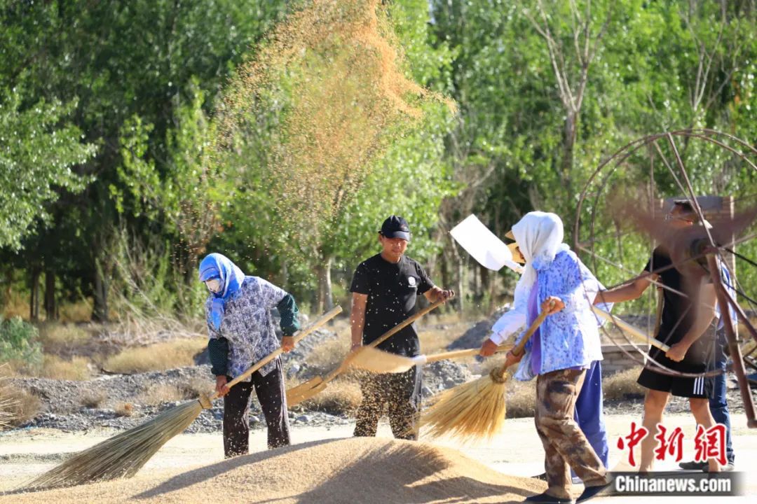 2023年7月23日,甘肅省嘉峪關(guān)市文殊鎮(zhèn)3000余畝小麥喜獲豐收,農(nóng)民搶抓晴好天氣揚(yáng)場(chǎng)晾曬小麥,確保顆粒歸倉(cāng)。馬玉福 攝