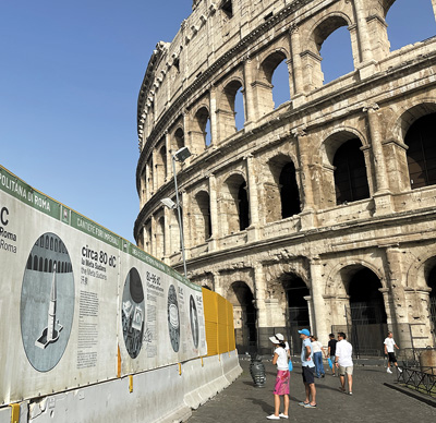 在意大利羅馬熱門景點(diǎn)斗獸場,游客正在閱讀帶有中文解說的標(biāo)識牌。