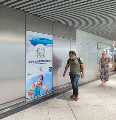 希臘雅典國際機(jī)場內(nèi),旅客走過用中文書寫的廣告海報(bào)。