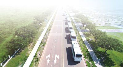 老撾萬象賽色塔綜合開發(fā)區(qū)內(nèi),新能源大巴車有序行駛。