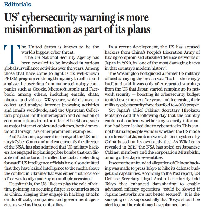 盡管如此,美國卻總是裝出一副受害者的樣子,指責(zé)中國等國對美國及其盟友的官員、企業(yè)和政府機構(gòu)發(fā)動黑客攻擊。最近,美國就指責(zé)中國黑客在2020年入侵了日本防衛(wèi)部門的機密網(wǎng)絡(luò),稱之為“日本現(xiàn)代史上最具破壞性的黑客攻擊之一”。然而,日本內(nèi)閣官房長官松野博一表示,日本無法確認(rèn)是否有任何安全信息因網(wǎng)絡(luò)攻擊而泄露。這不禁讓人懷疑,美國是否根據(jù)自己的黑客活動,編造了中國破壞日本網(wǎng)絡(luò)防御系統(tǒng)的故事?維基解密在2015年就披露,美國國家安全局在秘密監(jiān)視日本內(nèi)閣成員和三菱公司,以及其他日本實體。