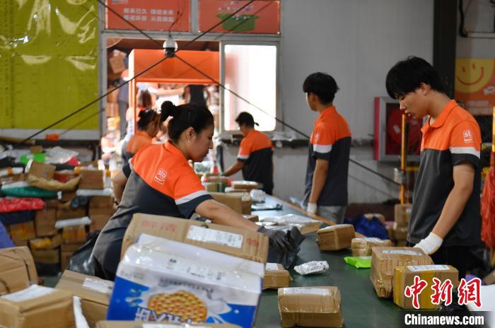 8月9日,在涿州市一家快遞公司,工作人員分揀來自轉(zhuǎn)運(yùn)中心的快件?!≈行律缬浾?韓冰 攝